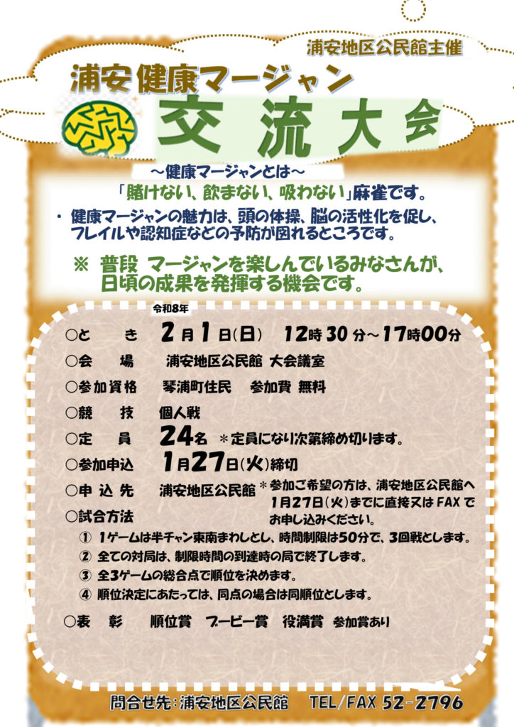 (画像は琴浦町HPより引用) 鳥取県琴浦町にて、町民向けの健康マージャン大会が開催! 詳細は以下のとおりです。 大会概要 項目内容大会名浦安健康マージャン交流大会日時2026年2月1日(日)12時30分~17時00分会場浦安地区公民館定員計24名(先着)参加... -